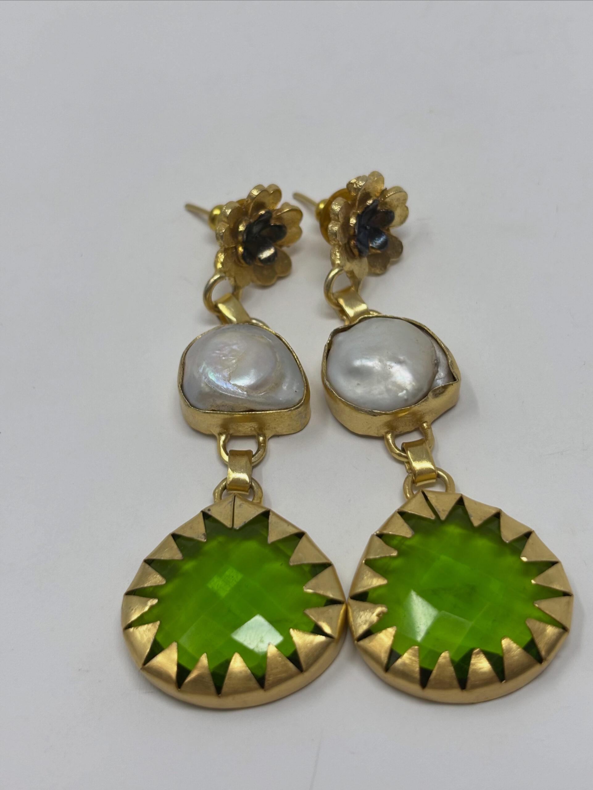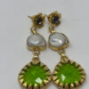 ARETES EXCLUSIVOS HECHOS A MANO EN PERLAS Y CRISTAL. TIENEN UNA TUERCA DE ONIX VERDE, SON Bañados EN ORO 18K. Elegantes.