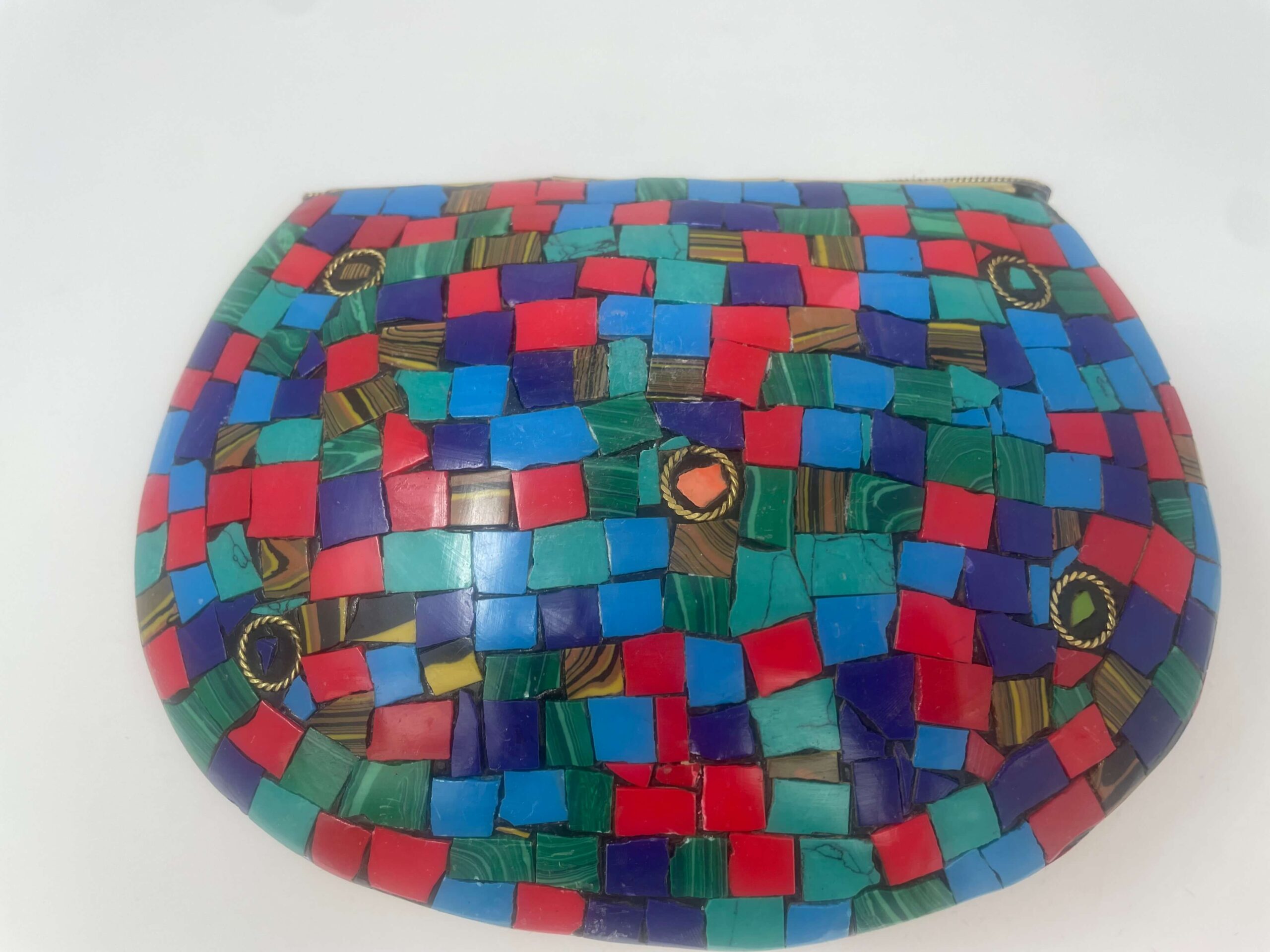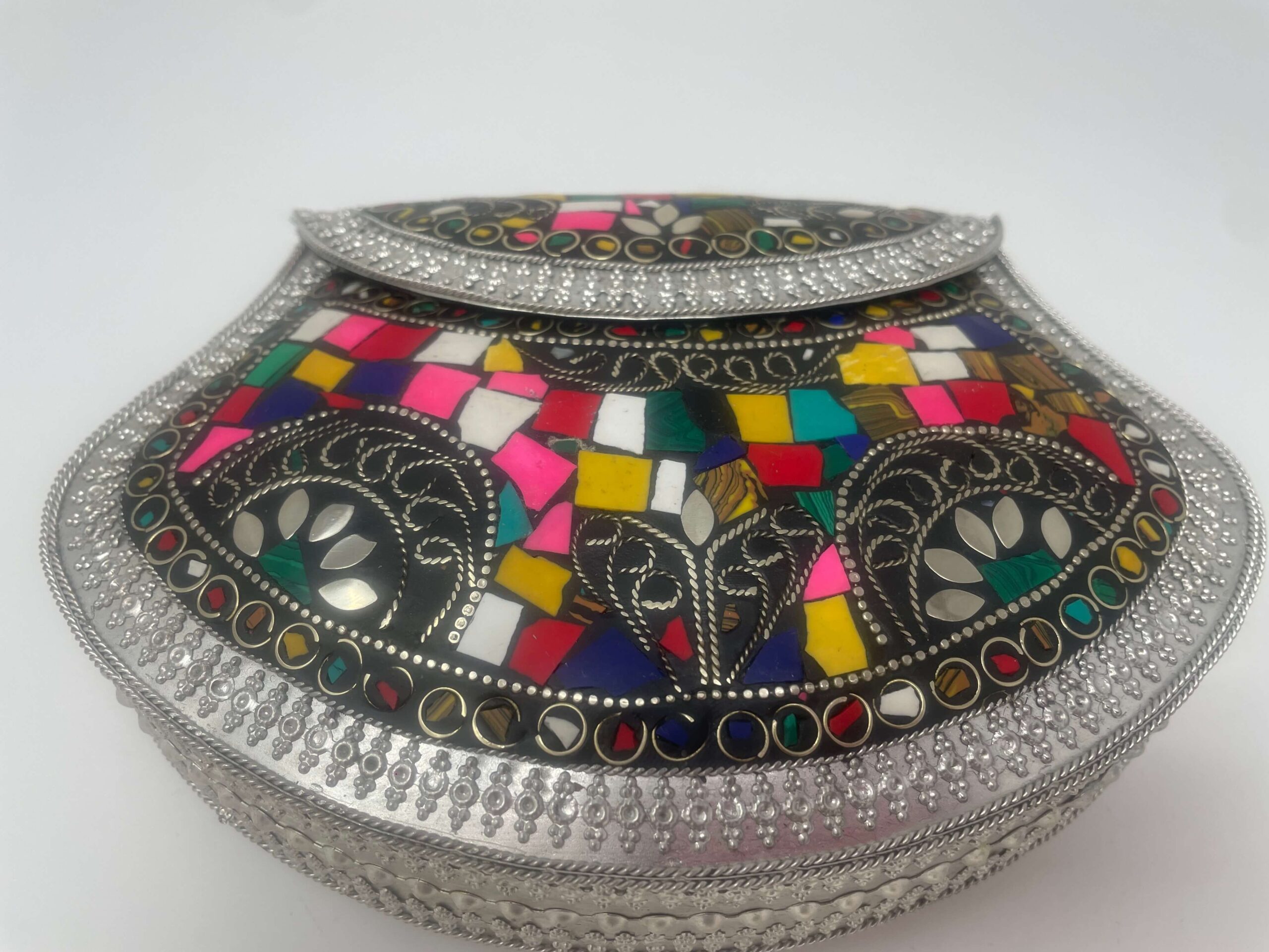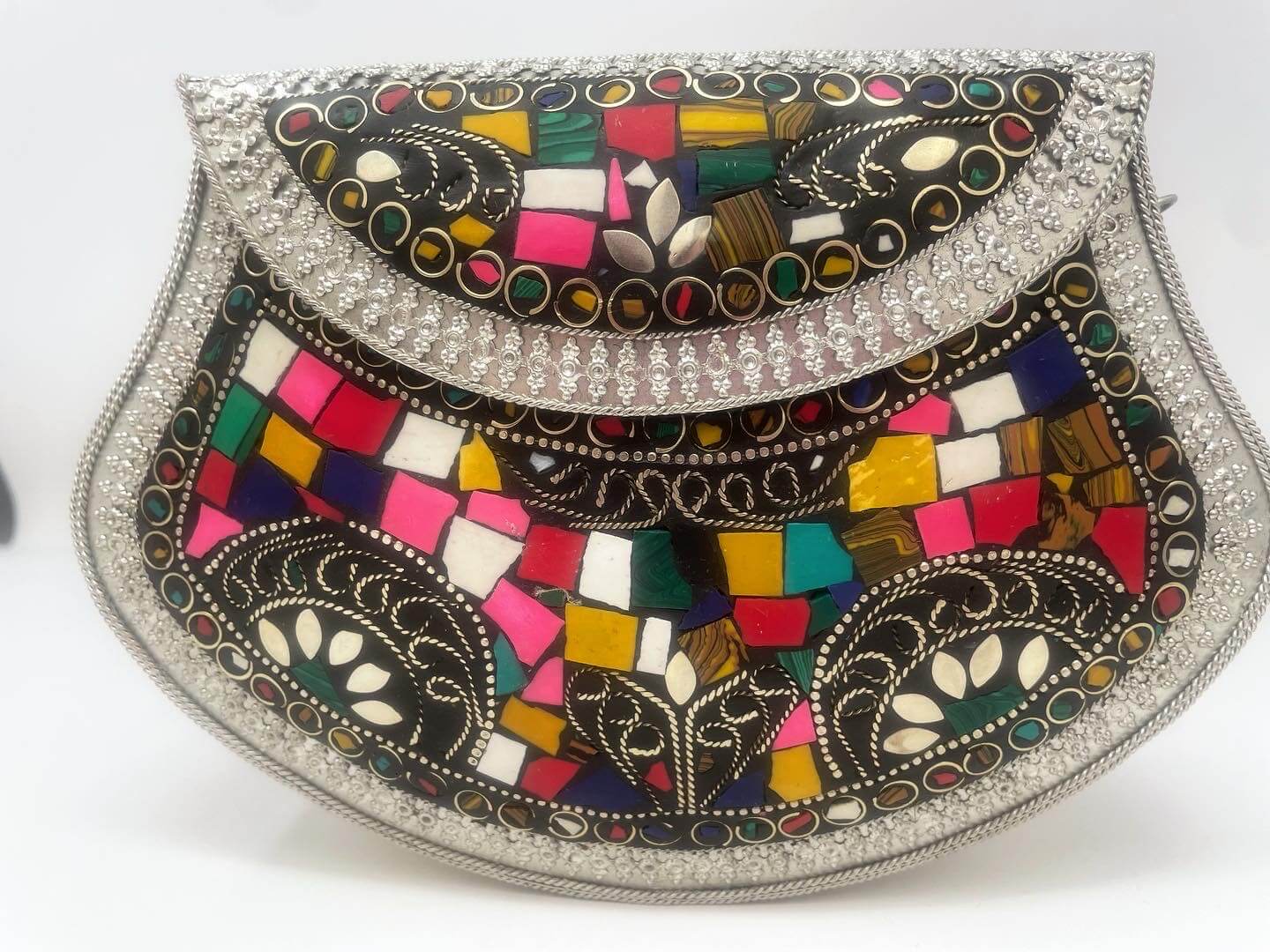 Bolso de metal hecho a mano con formas ovaladas. latón, mosaico cadena de metal, forrada en terciopelo